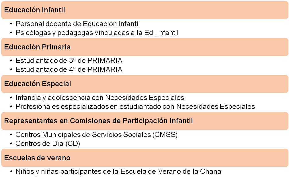 De forma complementaria, en este diagnóstico han participado también personas adultas profesionales vinculadas directa y diariamente con la infancia. Estas personas han sido concretamente personal docente, psicólogas y pedagogas que trabajan con los niños y niñas con edades comprendidas entre 0 y 6 años, garantizando la representación de esta primera y segunda infancia invisibilizada muchas veces, y personal docente que trabaja diariamente con la infancia y adolescencia con necesidades especial y que conoce a la perfección las particularidades y problemáticas específicas de estos niños, niñas y adolescentes.