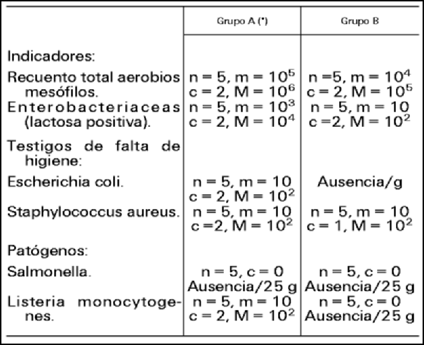 2. Las comidas preparadas de los grupos A y B cumplirán las siguientes normas microbiológicas: