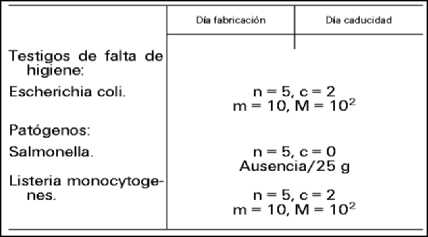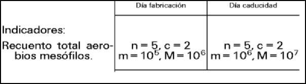 M = valor limite del número de bacterias. El resultado se considerará no satisfactorio si una o varias unidades que componen la muestra tienen un número de bacterias igual o mayor que M.