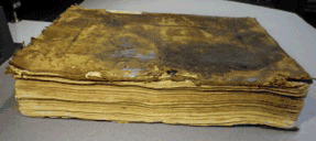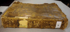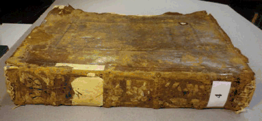 Encuadernación: La encuadernación de piel marrón, seguramente de cabra, presenta muchas faltas, sobretodo en los cantos de las tapas. La piel presente está en general en buena condición. La tapa inferior está muy dañada con micro-organismos, sobretodo en el canto delantero.