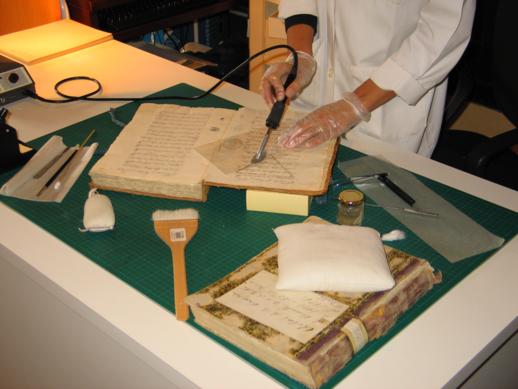 - El tratamiento en los documentos y los libros se limita a la eliminación en seco del polvo depositado, hasta que se proceda a su restauración en caso de necesidad, en el taller especializado.