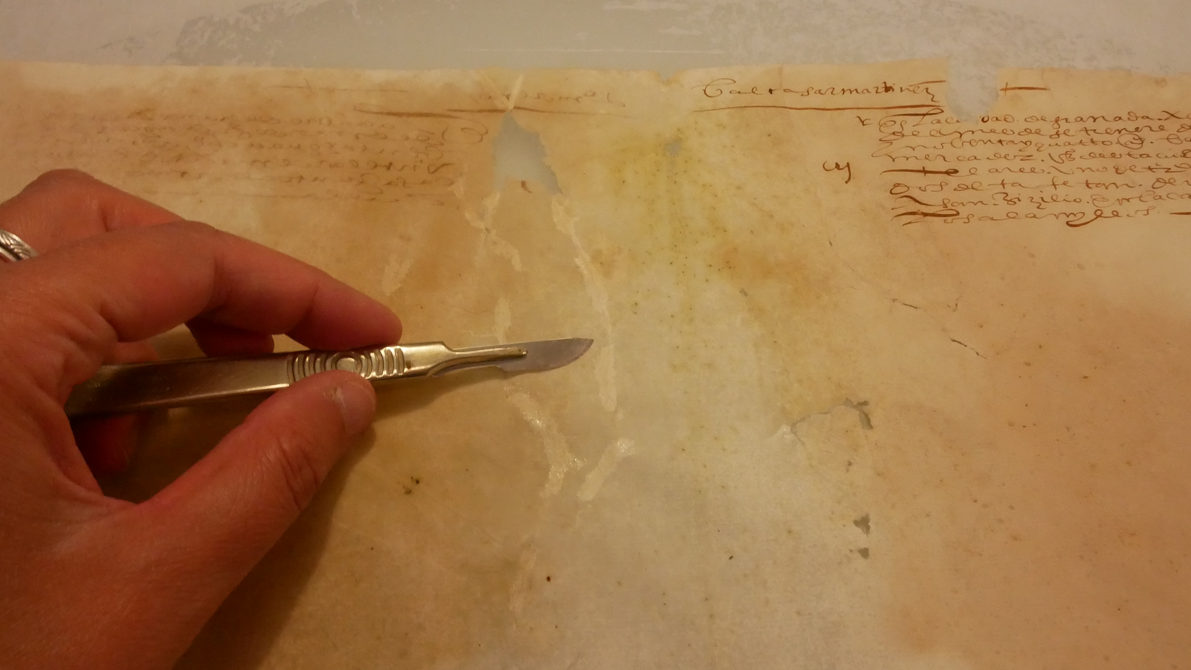 - Repasar los refuerzos e injertos con papel japonés. El papel japonés utilizado por los injertos presenta unas fibras muy cortas y entonces una resistencia mecánica limitada. Se ha utilizado otro tipo de papel japonés para los demás cuadernillos, en el tercer cuaderno se ha mantenido.