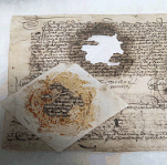 - En el caso de pérdidas de soporte más destacadas se procedió a laminar las hojas por el reverso con Archibond® y sobre este soporte se adhirió los injertos de papel japonés.