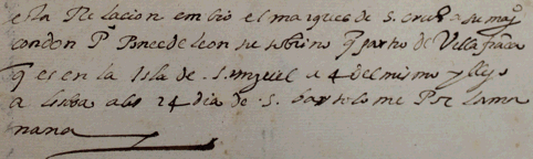 la envío el Marques de Santa cruz a su Majestad, con D.Pedro Ponce de León, su sobrino, que partió de Villafranca ( que es en la Isla de San Miguel) a 4 del mismo y llegó a Lisboa a los 24, día de San Bartolomé, por la mañana3.