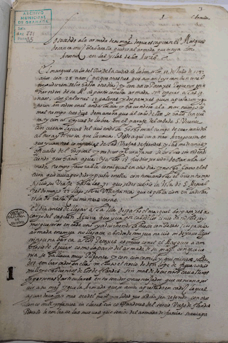 2. Encabezamiento de la carta que D. Álvaro de Bazán, primer Marqués de Santa Cruz, mandó con su sobrino D. Pedro Ponce de León y que llegó a Lisboa el 24 de agosto de 1582. AMGR.( Archivo Municipal de Granada)