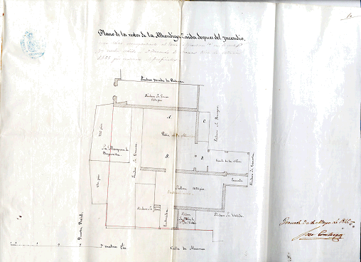 El edificio tenía estructura irregular y, como puede verse en la Plataforma de Vico (imagen 1), estaba formado por un gran patio cuadrado, donde aparecen dibujados dos carros, rodeado de naves rectangulares grandes, para el almacenamiento y venta de las mercancías, y pequeñas estancias para la gestión económico-administrativa (el “asiento” del almojarife). La entrada, según comenta Enríquez de Jorquera (Anales de Granada, pp. 79-80), y se aprecia en el plano de José Contreras de 1863, la tenía por la calle Mesones (imagen 2), y, si nos fijamos en el dibujo de la Plataforma, aparece resaltada con respecto a las casillas colindantes, que tienen cubiertas a dos aguas, pues está dibujada con techo plano y con una puerta muy grande para la entrada de los carros. La portada de la alhóndiga Zaida debió de ser, según Enríquez de Jorquera, de piedra labrada igual que la de la Casa de las Comedias, que estaba justo en frente, es decir tendría las mismas características: