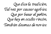 Y tras esta realidad van las muchachas granadinas el día de San Cecilio al Sacro-Monte, como palomas inquietas, queriendo encontrar en los subterráneos que la piedad venera, la luz del alma. Y así, cerrando los ojos para no ver la piedra del divorcio, que tiene sus devotos también, caen sobre la piedra de casarse como pajarillos incautos y sedientos sobre los juncos del río que fertiliza el valle y pasa por delante de los cármenes cantando una canción á la eternidad de la juventud.