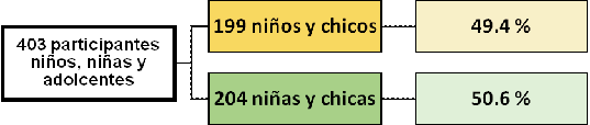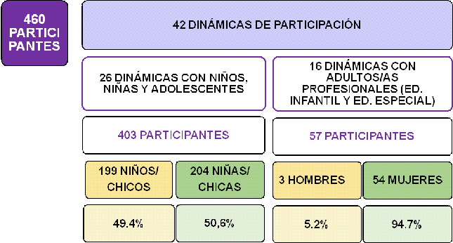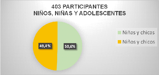 En relación a la participación de la infancia y a la adolescencia, han participado 403 niños, niñas y adolescentes, de las cuales 49,4% han sido niños y chicos, y un 50,6% han sido niñas y chicas. La participación masculina y femenina en la infancia y la adolescencia ha sido similar.