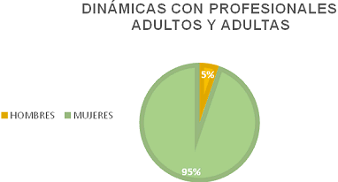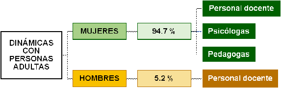 De las 57 personas adultas y profesionales que han participado (docentes, psicólogas y pedagogas), un 94.7% son mujeres, mientras que solamente un 5.2% son hombres. Este dato nos incita a pensar en la feminización de los trabajos relacionados con Educación y Servicios Sociales.