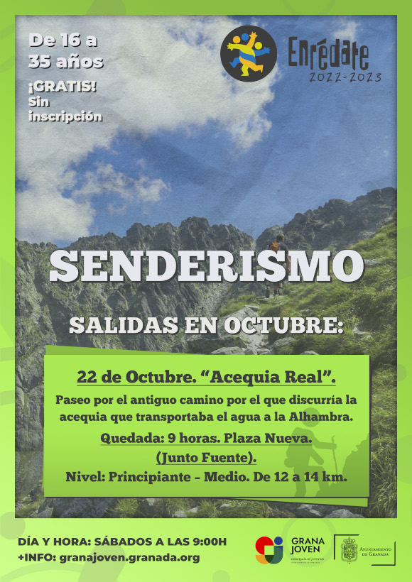 Acequia Real”. Paseo por el antiguo camino por el que discurría la acequia que transportaba el agua a la Alhambra. Quedada: 9 horas. Plaza Nueva. (Junto Fuente). Nivel: Principiante – Medio. De 12 a 14 km. Gratis y sin inscripciones. Jovenes entre 16 y 35 años.