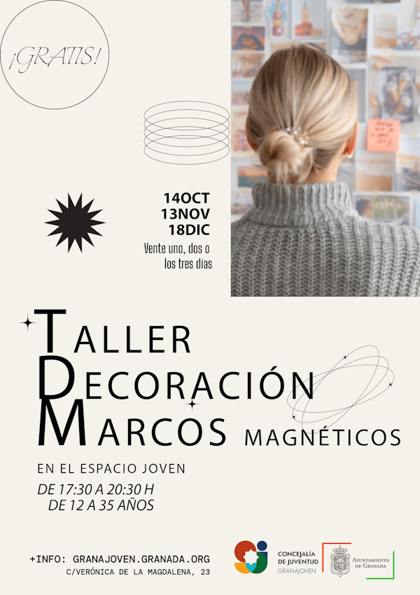 Octubre - Noviembre - Diciembre 2024Si tienes entre 12 y 35 años pásate por el Espacio Joven en las fechas programadas y participa en los siguientes talleres: pintura de neón, abalorios, decoración marcos magnéticos, decoración cuencos de cerámica ( con invitación previa), creación de mosaicos, llaveros de hama, chapas, hilorama,y scrapbook . Los viernes estarán reservados para los juegos de mesa y otros juegos.