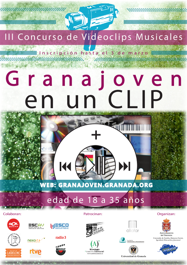 Arrancamos la tercera edición del Concurso Grana joven en un clip. Si tienes entre 18 y 35 años y un video clip musical no lo dudes preséntanos tu proyecto. Si tu video resulta premiado se emitirá en Sol música, lo difundirá radio 3 , TVE y Musiclip Festival y podrás recibir premios por un valor superior a 3000 euros. Recordaros que el plazo es hasta el 3 de marzo.