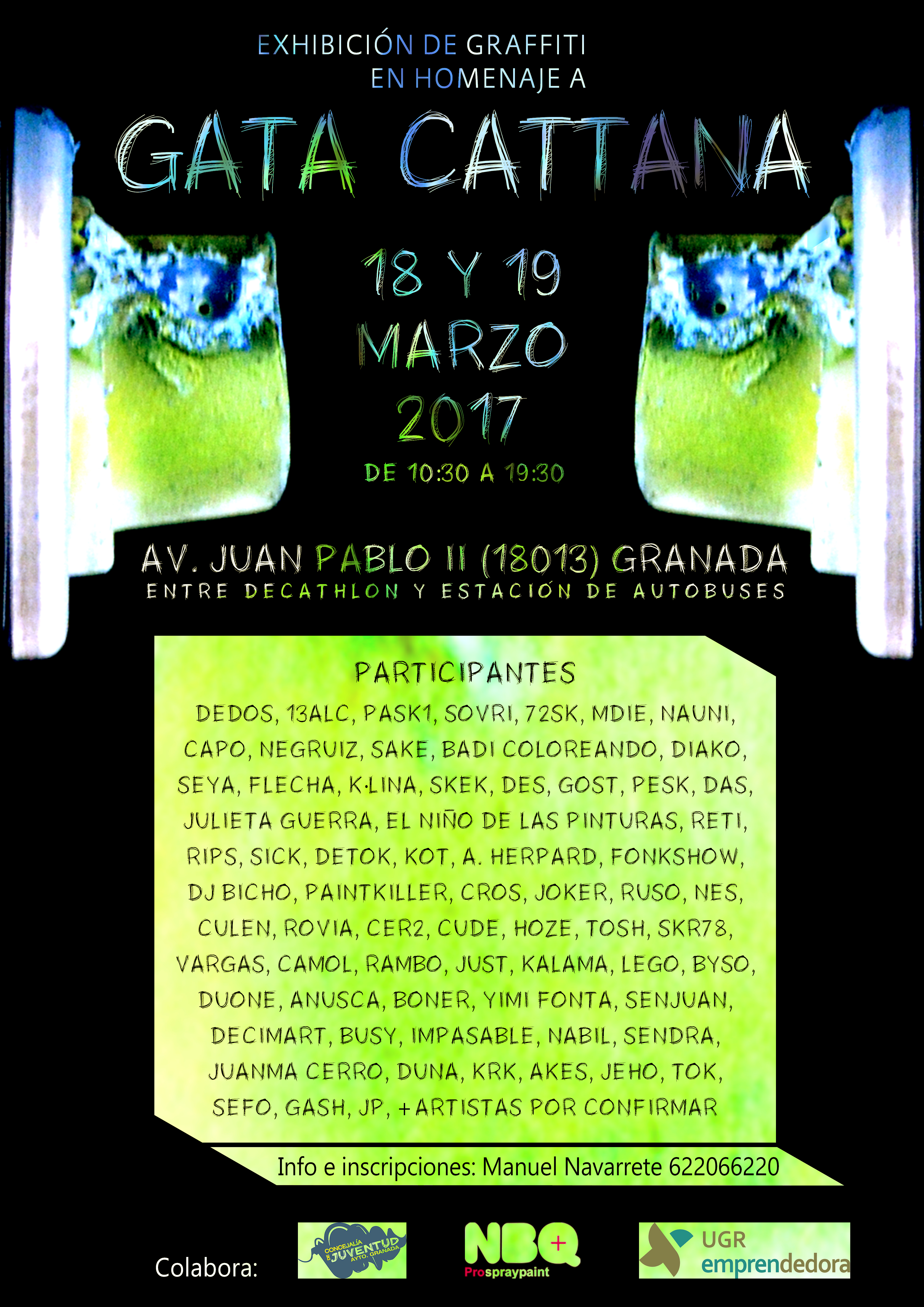 Homenaje a la poetisa y cantante Gata Cattana que falleció el pasado 2 de marzo. Exhibición de Graffiti que se realizará los días 18 y 19 de marzo en la Av. Juan Pablo II desde la mañana hasta la tarde. Participarán más de 100 artistas andaluces. Entre las obras artísticas que se plasmarán sobre el muro, las temáticas serán Gata Cattana, la música y la poesía.