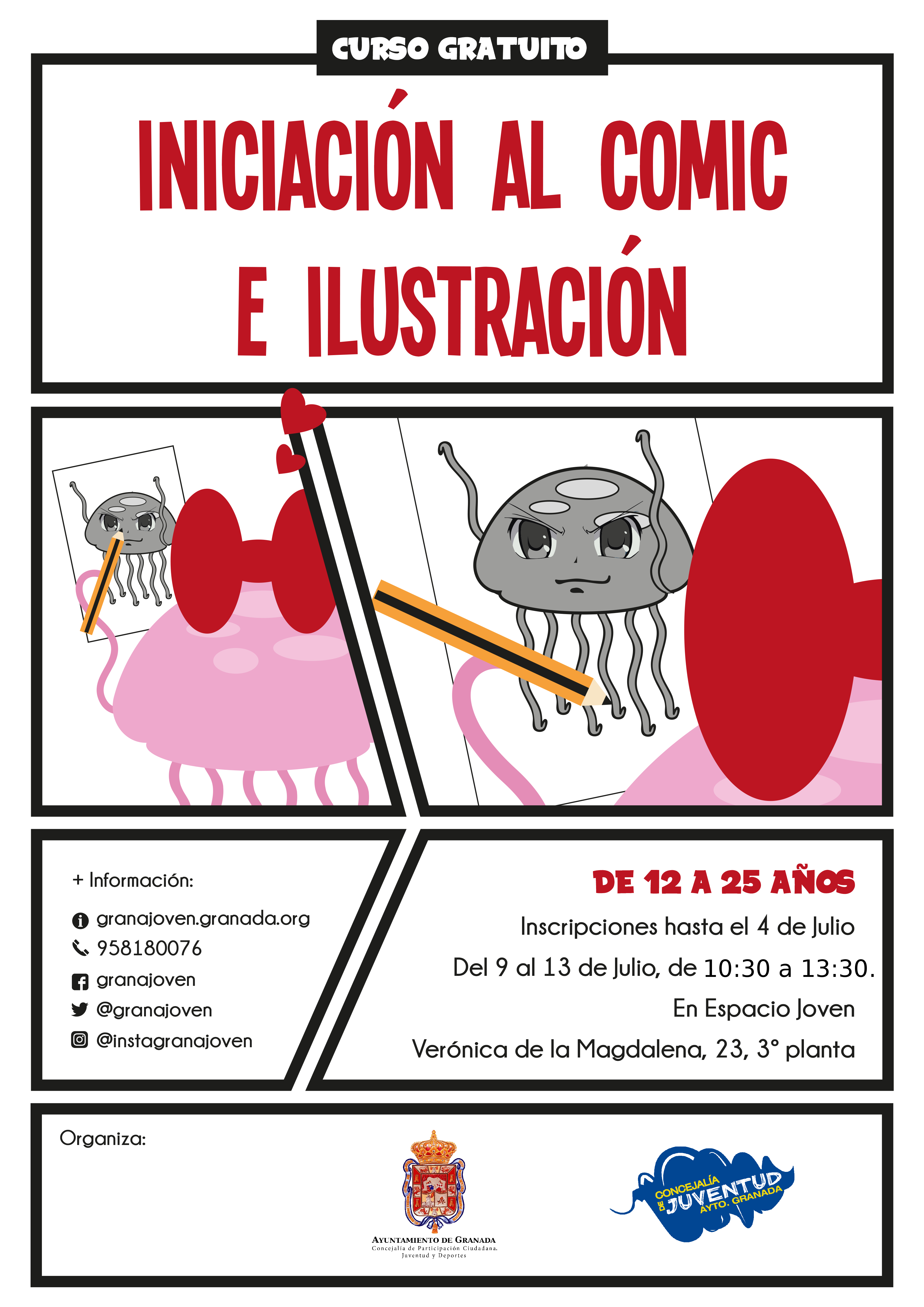Se trata de un curso de carácter básico, de iniciación al mundo del cómic y la ilustración en el que se buscará fomentar y desarrollar las habilidades para el dibujo del cómic presentes en el alumnado, así como potenciar sus capacidades de narración gráfica y mecanismos de expresión gráfica y visión espacial.