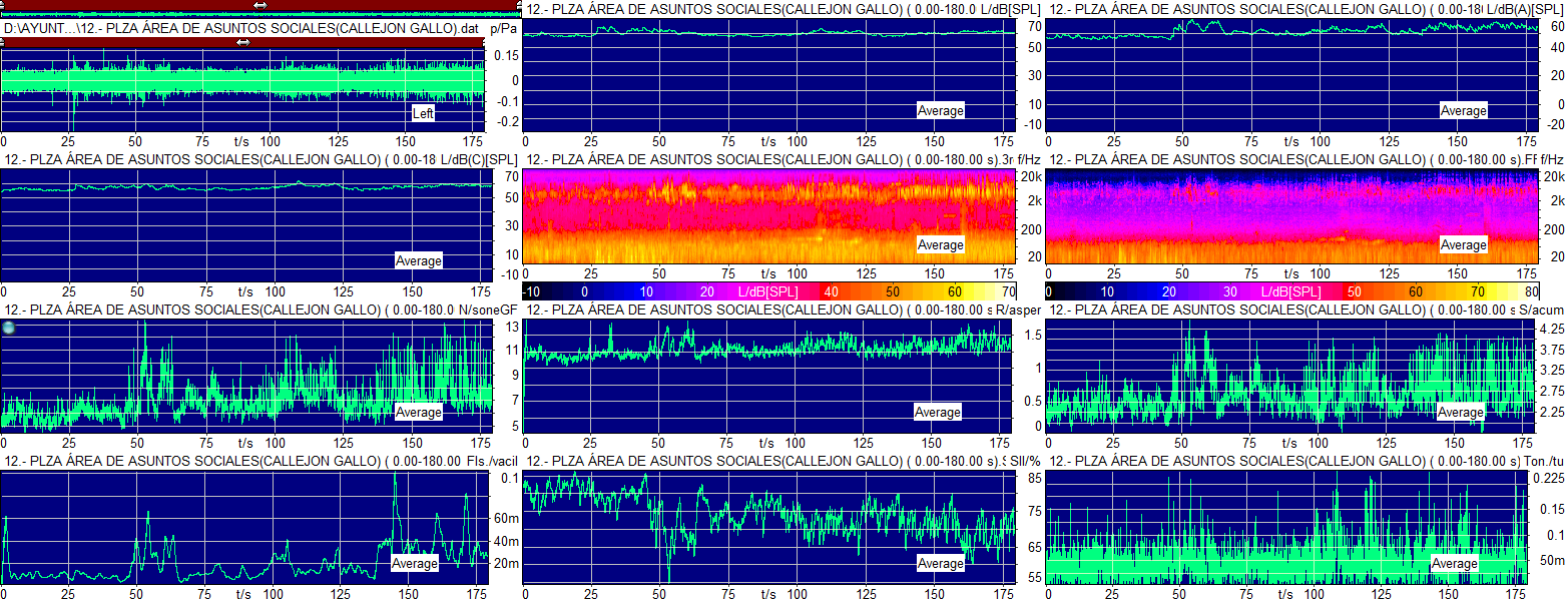 En este espacio se escucha sobre todo el sonido procedente de las aves que habitan en solares próximos, siendo destacable el suave murmullo reverberante que los sonidos producen en la plaza. Las características psicoacústicas de los sonidos que llegan a la plaza, son en gran medida similares a los del callejón, con la diferencia que aquí son muy apreciables los cantos de las aves lo que se traduce en un sensible aumento de los sonidos en medias y altas frecuencias. Es un sonido de alta frecuencia con modulación en frecuencias medias-bajas que contribuye a proporcionar un sonido envolvente que da riqueza a los trinos de los pájaros. La inteligibilidad en el área es buena y es un ambiente calificado como agradable que permite la comunicación oral o el desarrollo de otras actividades de concentración con niveles inferiores a 55 dBA. Resulta interesante buscar puntos dentro de la misma plaza con acústica distinta. Ejemplo: si nos situamos en la parte que da al callejón del mismo nombre, se aprecia un mayor predominio de frecuencias bajas que si nos situamos mas al interior de la placeta, evitando la influencia del callejón.