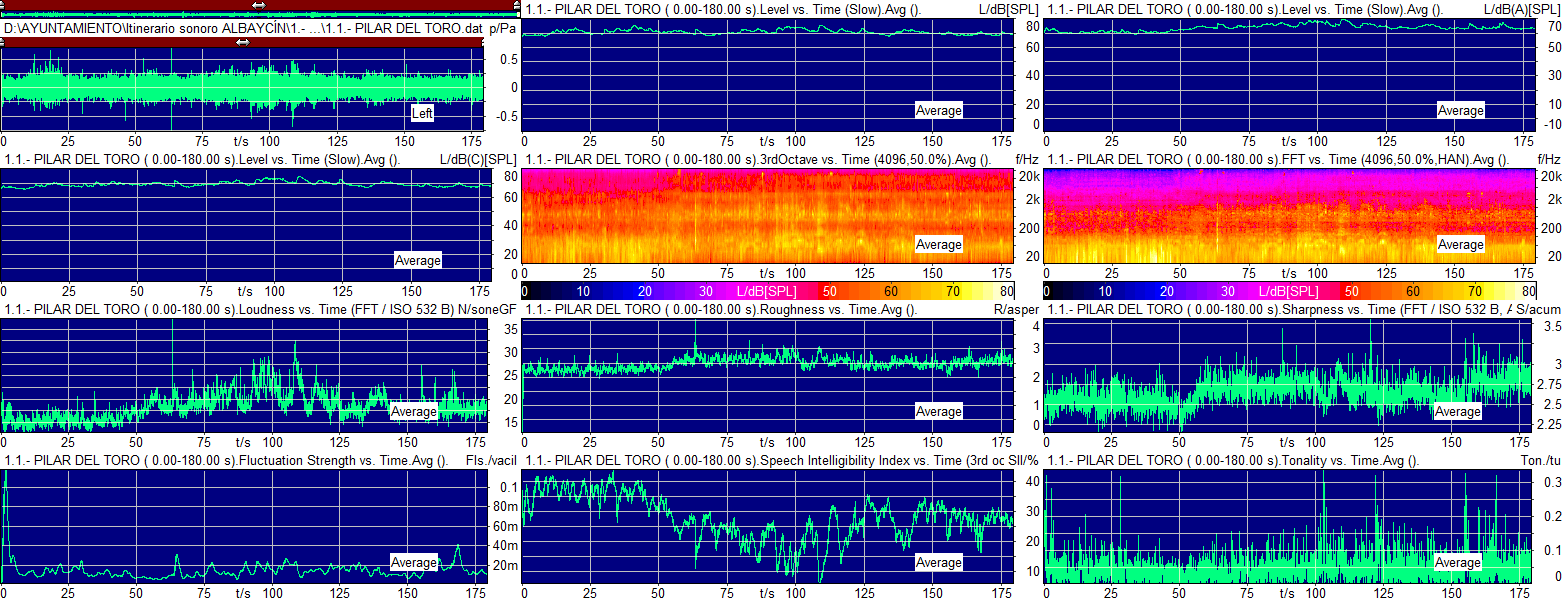 El sonido registrado (aproximadamente a 3 metros de la fuente) es constante con un predominio moderado de las frecuencias bajas y niveles de sonido inferiores a 65 dBA. La sonoridad percibida es baja, lo que se corresponde con un sonido agradable, aspereza moderada y con un nivel de interferencia en la comunicación verbal inferior a 60 dB lo que permite entender los mensajes orales y apreciar la modulación de baja frecuencia constante que subjetivamente permite un descanso auditivo de los ruidos propios de la ciudad a su vez caracterizados por una modulación media. Como es lógico, la influencia de la fuente en estos parámetros varía con la distancia a la misma.