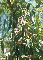 | Arbolito caducifolio de 8-12 m de altura con ramas delgadas, flexibles, largas y colgantes casi hasta el suelo. Tronco con la corteza fisurada. Hojas linear-lanceoladas, de 8-16 cm de longitud, acuminadas, de borde finamente aserrado, lampiñas y algo glaucas en el envés cuando adultas. Pecíolo corto y algo pubescente. Inflorescencias que aparecen al mismo tiempo que las hojas. Son amentos cilíndricos de 2.5-5 cm de longitud, con flores de color amarillo pálido. En cultivo solamente se conocen pies femeninos. Florece de Abril a Mayo. | ![]() Foto: Elaboración propia. Parque García Lorca. Junio 2002 |