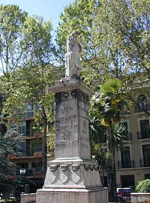 Situada en la Plaza de Mariana de Pineda. Mandada erigir en 1841 por el municipio y hecha por Miguel Marín y Francisco Morales en 1869-1870. La plaza se construyó entre 1833 y 1843 por orden de D. Francisco Javier Abadia, Capitán General de Granada. La figura de Mariana de Pineda, con su muerte serenamente heroica, quedó en la memoria popular como símbolo revolucionario. Su vida fue efímera, como una primavera granadina. Había nacido el 1 de septiembre de 1804, en el barrio de la parroquial de Santa Ana. Hija natural de don Mariano de Pineda, aristócrata, capitán de navío, de la Real Armada y Caballero de la Orden de Calatrava, y de María Dolores Bueno, de Lucena (Córdoba), de familia humilde, al servicio de la casa de los Pineda, según confesión de don Mariano en 1804: "Hace más tiempo de dos años saqué de mi casa y llevé en mi compañía ...". La separación de su madre y la muerte prematura del padre llenó de dificultades los primeros años de la pequeña Mariana, que al final fue dada en tutoría a un matrimonio sin hijos al servicio de los Pineda. A partir de entonces la heredera de don Mariano tuvo una infancia llena de ternura de aquellas personas a las que reconoció como padres. La niña recibió educación en el Colegio de Niñas Nobles de Granada. A los 15 años contraía matrimonio con Manuel Peralta y Valte, militar de ideas liberales. En 1822, en pleno trienio constitucional, Mariana quedaba viuda con dos hijos de corta edad. El 1 de octubre de 1823 era abolida la Constitución. Fernando VII, dispuso: "Son reos de lesa majestad y quedan condenados al patíbulo los que se declaren contra los derechos del rey o a favor de la Constitución". Se suprimían las libertades, la Iglesia recuperaba sus privilegios y se restauraba el régimen señorial y represivo del primer periodo absolutista. Granada vuelve a vivir días aciagos. Se recrudece la lucha de los partidos liberal y absolutista. Las cárceles se hacinan de hombres perseguidos por sospecha o denuncia. Y tras juicios sumarísimos son conducidos al patíbulo. En estas circunstancias se inicia la militancia de Mariana de Pineda que se va a desarrollar durante la llamada "década ominosa" (1823-1833). Mariana se incorpora a las tertulias donde se conspira, la principal en la casa de los Montijo, en su mismo barrio de Gracia; se convierte en enlace y recibe la correspondencia de los exiliados en Gibraltar, que llega con nombres falsos; gestiona falsificados pasaportes para gentes perseguidas; asiste a los presos en la cárcel, entre los que se encuentra un tío y un primo, Fernando Álvarez de Sotomayor, condenado a muerte, al que ayuda a evadirse de la prisión vestido de fraile capuchino, disfraz que ella le proporciona. Desde un primer momento la policía no duda de la implicación de Mariana, pero a pesar de la vigilancia a que es sometida no logran inculparla. Corría el año 1828 y en Granada y su provincia se pregonaba el precio de la cabeza del capitán. Empezaba a alborear la condena de Mariana, pues además de la sospecha por la huida de su primo, estaba procesada por unos documentos comprometedores, que descubrió la policía al efectuar un registro en su casa de la calle Águila. Vino a agravar la situación la denuncia de Romero Tejada, preso en Málaga, al relacionarla con los "anarquistas" de Gibraltar, término que servía para calificar a todo sospechoso de actividad política, como ocurría en el siglo XX con el de masón y comunista. Siguieron años de agitación, peligro, represión y estrecha vigilancia para la comprometida mujer, acosada amorosamente por el todopoderoso Ramón Pedrosa, enviado a Granada por el ministro de Justicia, para sofocar el turbulento ambiente político de la ciudad. A principios de 1831, los acontecimientos políticos habían extremado su virulencia y la esperanza de los liberales, tras fracasadas y sucesivas sublevaciones contra la tiranía absolutista, comenzaron a desfallecer. Los frustrados intentos de alzamiento de los correligionarios de Mariana de Pineda la obligaron a interrumpir la confección de una bandera, que por orden suya bordaban dos hermanas del Albaicín, con los lemas Libertad, Igualdad y Ley. A mediados de marzo, por una delación, Pedrosa conoce la existencia de una bandera para un proyectado alzamiento de los liberales granadinos. Pedrosa obliga a las bordadoras a llevar la bandera a medio terminar a la casa de Mariana. Inmediatamente, se presenta la policía a efectuar un registro. Ante el desconcierto de Mariana, la bandera escondida, precipitadamente, en el hueco de una hornilla es descubierta por los agentes de Pedrosa. El decreto de 1º de octubre de 1830 sirvió de base para la aplicación de la pena capital impuesta a Mariana de Pineda. La condena fue enviada a la Corte para su revisión. Fernando VII estimó la propuesta "justa y arreglada a la ley" y firmó la sentencia de muerte. Su cumplimiento se llevaría a cabo en la forma ordinaria de garrote vil. Al conocer la sentencia Mariana dijo: "El recuerdo de mi suplicio hará más por nuestra causa que todas las banderas del mundo". Ramón Pedrosa estaba autorizado por José Calomarde, ministro de Justicia, a indultar a la reo, a cambio de la delación de los nombres de sus correligionarios. Mariana tuvo para la propuesta enérgicas palabras de repulsa: "Nunca una palabra indiscreta escapará de mis labios para comprometer a nadie. Me sobra firmeza de ánimo para arrostrar el trance fatal. Prefiero sin vacilar una muerte gloriosa a cubrirme de oprobio delatando a persona viviente". El compromiso y militancia de Mariana de Pineda no fue una excepción en la escena política de su época. En la Gaceta de Madrid, periódico oficial y único superviviente de la prohibición de la prensa decretada bajo Fernando VII, en el comunicado hecho público de la ejecución de Mariana de Pineda, trece días después del luctuoso suceso, se leía: "El 26 de mayo último sufrió en Granada la pena d