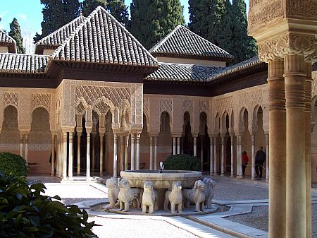 Patio de los leones, llamado así por la fuente central formada por 12 leones que funcionan como surtidotes. A los lados de este patio se encuentran las salas de las dos hermanas y la sala de los Abencerrajes.