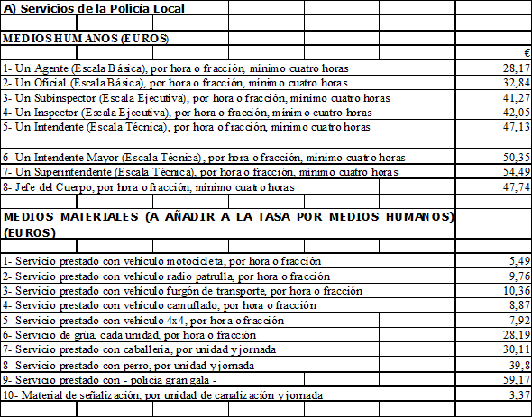 | B) Servicios prestados por el personal de Extinción de Incendios (EUROS) | Precio unitario | Precio por hora |