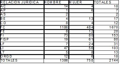A continuación se reflejan los datos relativos al personal al servicio del Ayuntamiento de Granada, correspondientes al año 2014, desagregados por sexos, en función del Grupo, la Relación Jurídica y la Concejalía de adscripción.