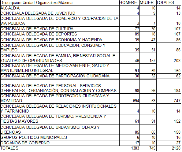 Sin ninguna pretensión de estudio, que tendrá que venir después, simplemente como una recogida de datos cuantitativos de personas trabajadoras en el Ayuntamiento, encontramos ya algunos que llaman la atención. El primer dato que nos llama la atención es que nos encontramos ante una plantilla desequilibrada en cuanto a su composición por mujeres y hombres. Así en cuanto a la composición de los distintos grupos o categorías profesionales observamos que la mayoría de los grupos son principalmente masculinos (sobre todo en el C1 advertimos que la diferencia es enorme), aunque con algunas excepciones como la de los grupos 0 y A2 en que la tendencia se invierte.