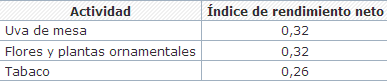 Los índices de rendimiento neto aplicables en el método de estimación objetiva del Impuesto sobre la Renta de las Personas Físicas en 2015 por las actividades agrícolas que se mencionan a continuación serán, en sustitución de los establecidos en el anexo I de esta Orden, los siguientes: