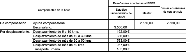 1. Los componentes y cuantías de las becas de carácter general para las enseñanzas universitarias conducentes al título de grado, de master, de licenciado, de ingeniero, de arquitecto, de diplomado, de maestro, de ingeniero técnico y de arquitecto técnico, de enseñanzas artísticas, y de otras enseñanzas superiores serán los siguientes: