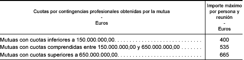 1. La cuantía máxima de la compensación que podrá percibir cada miembro de la junta directiva por su asistencia a las reuniones de la misma, teniendo en cuenta las cuotas totales obtenidas por la mutua en el ejercicio anterior, queda establecida del modo siguiente: