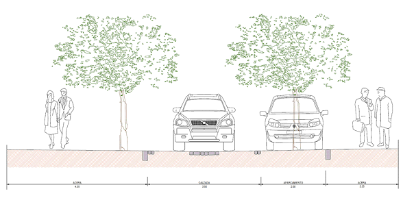 La sección constructiva, para la totalidad de las calles en las cuales se actúa, presentará una calzada de 3,50 metros de ancho y un único carril de circulación. Se dejarán aparcamientos funcionales para personas con movilidad reducida y para carga/descarga, todos ellos en línea. Esta sección dispondrá de aceras en ambas márgenes de ancho variable desde los 3,0 metros hasta los 4,20 m en su mayoría, hasta alcanzar la línea de fachada. Como elemento separador entre calzada y acera se dispondrá un bordillo granítico enrasado con la calzada.