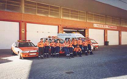Voluntarios junto a los vehículos a las puertas de nuestras instalaciones.