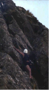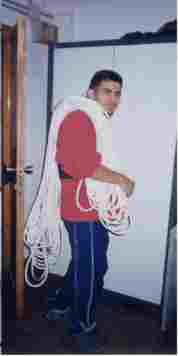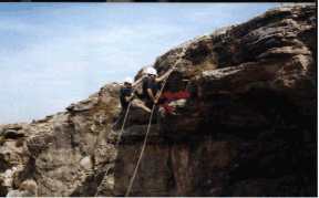 | Las jornadas prácticas en técnicas de escalada fueron alternándose con otras en las que se practicaba en exclusiva técnicas de Ráppel (descenso por paredes verticales mediante ocho) y Ráppel libre (descenso por cuerda sin tocar la pared, también mediante ocho). Estas últimas técnicas son, en mi opinión, las de mayor utilidad para el rescatador, junto al empleo de puños ascensores para encarar el ascenso a lugares inaccesibles. Tanto el ocho como una vía abierta por un escalador y preparada para un puño ascensor permitirían el acceso de un equipo de rescatadores cargados con equipo al lugar del siniestro. En definitiva, éste es el objetivo de las prácticas que realizamos, mejorar nuestra capacidad de acceso a lugares dificultosos con el equipo suficiente para hacer una valoración del herido y un primer tratamiento de urgencia (RCP, inmovilizaciones, hemorragias, etc.) hasta que sea posible la evacuación de la víctima.