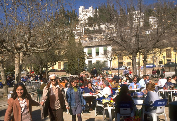 Terrazas al aire libre. Hotel Alhambra Palace al Fondo.