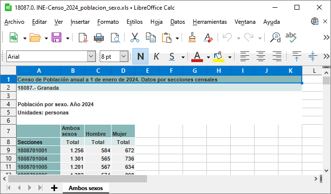 La información estadística se presenta en formato Excel XLS tabulada según las unidades territoriales de sección censal. Cada fichero posee tres hojas. La primera, de nombre