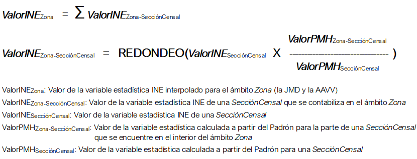 A partir de los ficheros del INE en los que la información está distribuida según secciones censales se aplica un proceso de interpolación lineal que utiliza la información padronal a la misma fecha para distribuir las variables estadísticas del INE según las