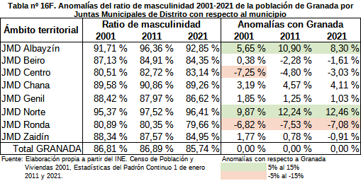 Al hacer el cálculo de anomalías según la fórmula señalada en el epígrafe 7.4 se revela que existen dos distritos, JMD Albayzín y Norte, que poseen ratios de masculinidad del 92% y 96% muy superiores a la ratio del 86% del municipio, y un distrito, la JMD Ronda, que posee una ratio del 80% muy inferior a la del municipio. También se observa que en 2001 la JMD Centro de poseía una ratio del 81% muy inferior a la del municipio que decenio a decenio va convergiendo con la media del municipio.