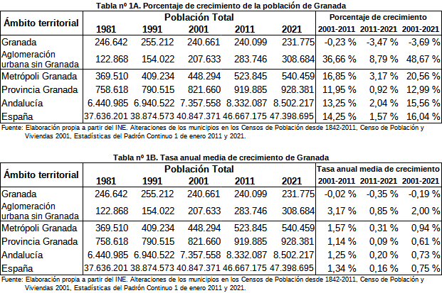 En el periodo estudiado de 2001 a 2021 el crecimiento de la población en el municipio de Granada experimentó un progresivo decremento. En total, en el periodo 2001-2021 la población de Granada ha disminuido en 8.886 personas, cifra que representa una disminución del -3,69% de la población existente en 2001 y una tasa anual del -0,19%. Esta evolución contrasta con el crecimiento experimentado en el mismo periodo por la aglomeración urbana sin Granada (+101.051 personas, +2,00% anual), Andalucía (+1.144.659 personas, +0,73% anual) y España (+6.551.324 personas, +0,75% anual).