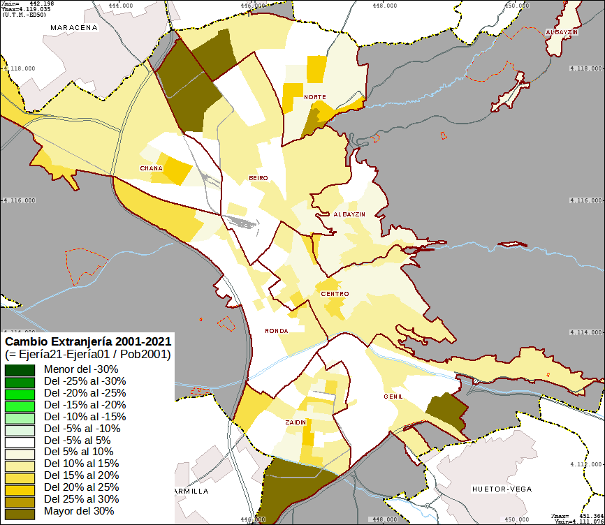 - las zonas de expansión urbana del periodo 2001-2021 que ganan población, al nor-oeste, sur y sur-este, incrementan el número de "extranjería" con respecto al año 2001. Dicho de otra forma, la nueva población procede en parte de extranjeros y nacionalizados, pero en menor medida que el incremento de "granadinos".