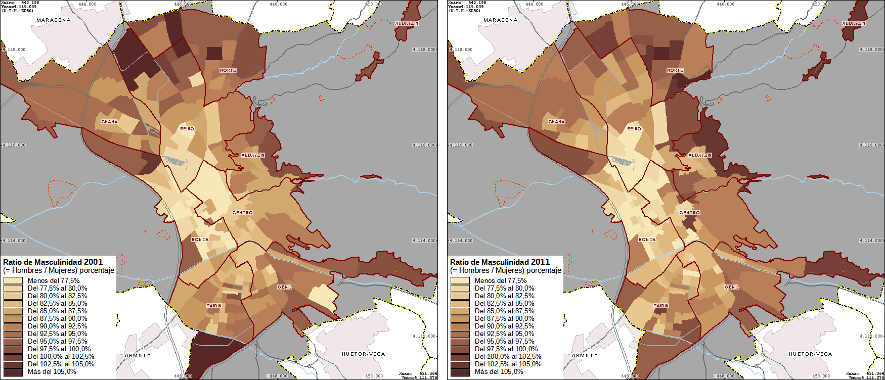 Al hacer el cálculo de anomalías según la fórmula señalada en el epígrafe 7.4 se revela que existen dos distritos, JMD Albayzín y Norte, que poseen ratios de masculinidad del 92% y 96% muy superiores a la ratio del 86% del municipio, y un distrito, la JMD Ronda, que posee una ratio del 80% muy inferior a la del municipio. También se observa que en 2001 la JMD Centro de poseía una ratio del 81% muy inferior a la del municipio que decenio a decenio va convergiendo con la media del municipio.