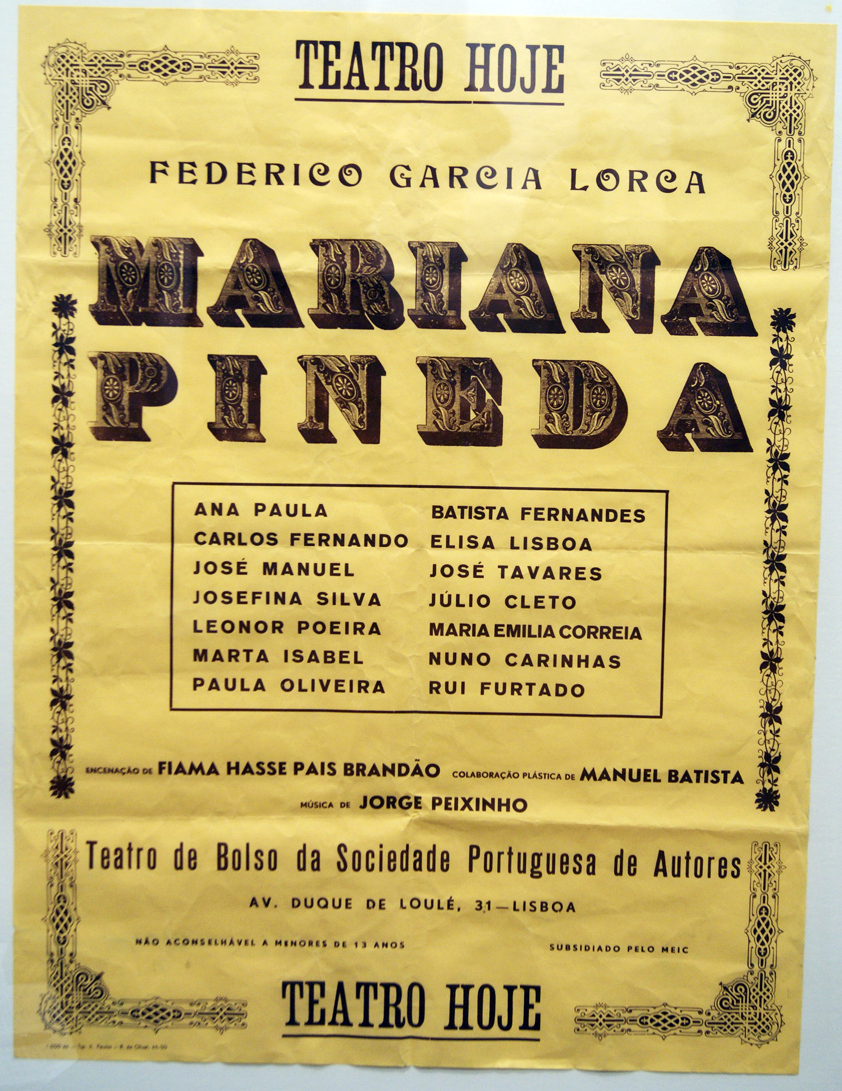 | Descripción | Cartel publicitario de la representación de la obra Mariana Pineda de Federico García Lorca en el Teatro de Bolso da Sociedade portuguesa de Autores de Lisboa a cargo de la compañía de Teatro Hoje, siendo su directora (y coofundadora de dicha compañía de teatro) Fiama Hasse Pais Brandão (1930-2007).