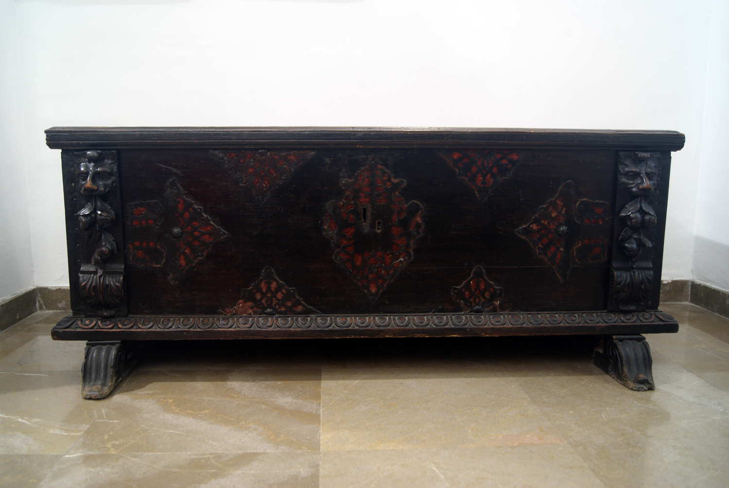 Arcón de madera oscura tallada con dos altorelieves con leones en las dos esquinas frontales, de cuyas bocas prenden frutas. Zona baja con relieves con decoración geométrica y las dos patas delanteras sobresalientes de la estructura. En el frontal presenta detalles ensamblados en metal con decoración vegetal y en sus huecos, resaltando el detalle, con un material diferente, que parece tela en terciopelo.